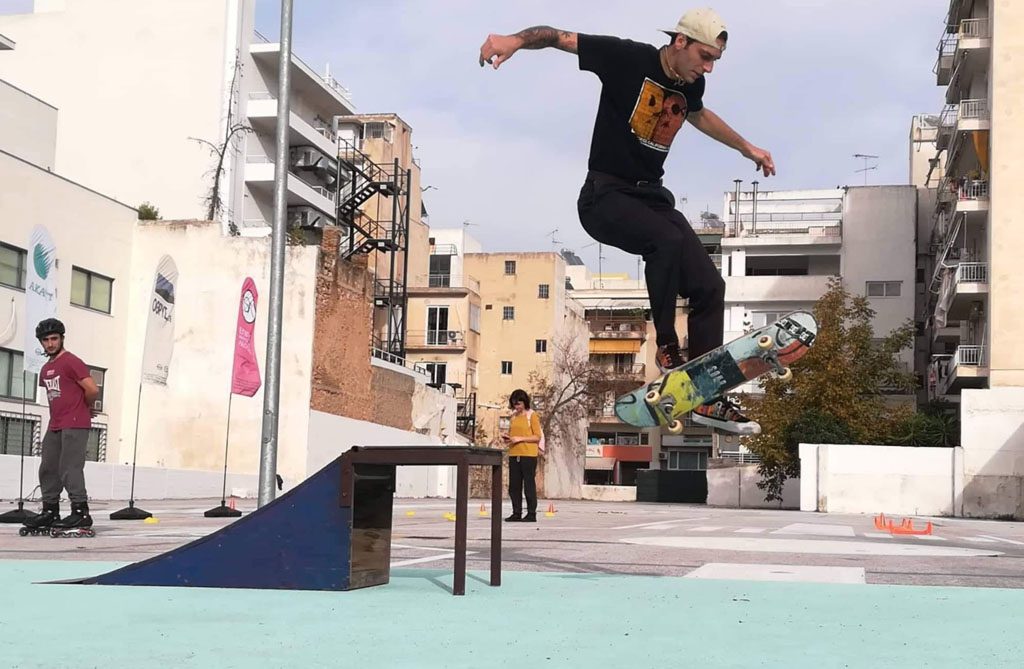 Για να μπούμε στον ελληνικό μικρόκοσμο του σκέιτμπορντ μιλήσαμε με τον Πάνο Τζιράκη, ο οποίος, πέρα από το ότι κάνει ο ίδιος πατίνια και σκέιτ, μυεί νέα παιδιά στον κόσμο του μέσα από το οργανωμένο τμήμα του στον παναθλητικό όμιλο του συλλόγου στην Καλλιθέα. «Κάνουμε μαθήματα για πατίνια και σκέιτμπορντ είτε στο ΚΠΙΣΝ Σταύρος Νιάρχος είτε στο 15ο δημοτικό Καλλιθέας όπου μας έχει παραχωρήσει το χώρο η διεύθυνση πρωτοβάθμιας εκπαίδευσης. Για εκεί έχουμε φτιάξει μόνοι μας μερικές ράμπες και ένα rail, καθαρά για εκπαίδευση. Έχω αρκετά πιτσιρίκια στην ομάδα μου μαζί με κάποιους πιο μεγάλους. Έχω γύρω στα 30 παιδιά, και αγόρια και κορίτσια, που είναι τα περισσότερα δημοτικού και μερικά γυμνασίου. Συνήθως μετά φεύγουν. Μαθαίνουν πρώτα τα βασικά και μετά βρίσκουν παρέες έξω και κάνουν σκέιτμπορντ. Αυτό που μου κάνει εντύπωση στο σύλλογό μου είναι ότι βοηθούν πολύ και οι γονείς, το βλέπουν κανονικά ως άθλημα και θα κάνουν και το κάτι παραπάνω για τα παιδιά».